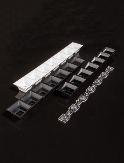 Solución lineal de 280 x 40 mm con pantalla 7X1 en negro brillo y mate, blanco y metal.